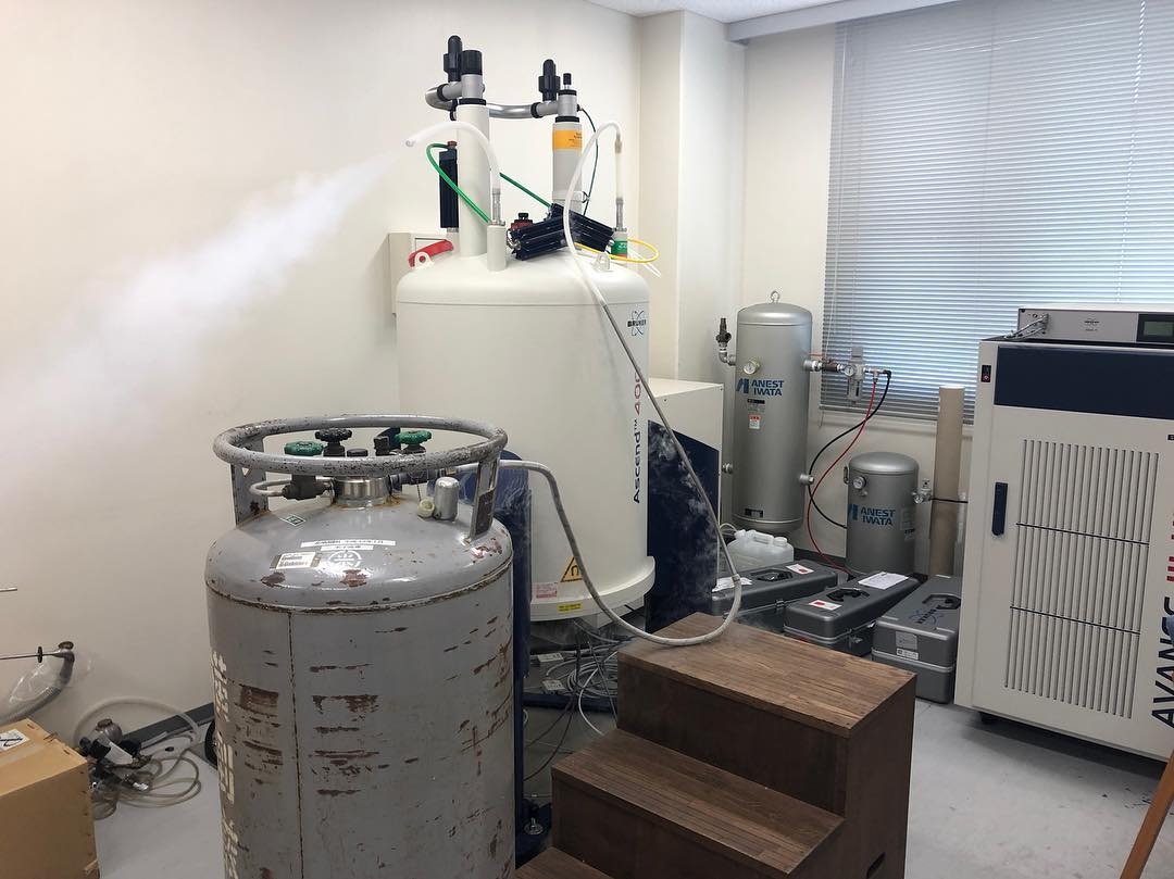 続きを読む分析装置の維持管理に休日はありません。この核磁気共鳴装置(NMR)は、2014年に約4,000万円で前装置から更新されました。NMRは超電導を維持するため、液体ヘリウムを用いますが、その液体ヘリウムの蒸散を抑えるために液体ヘリウムの周りを液体窒素で冷却しています。液体窒素は真空層で外気温から守られていますが、1週間に一度の補充が必要です。