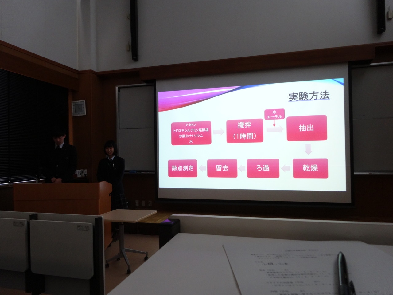 続きを読む物質工学科では1学年から各学年で、プロジェクターを使って発表を行っています。 3年では、有機化学基礎実験で、1年間に実験した内容について、結果や考察を発表します。