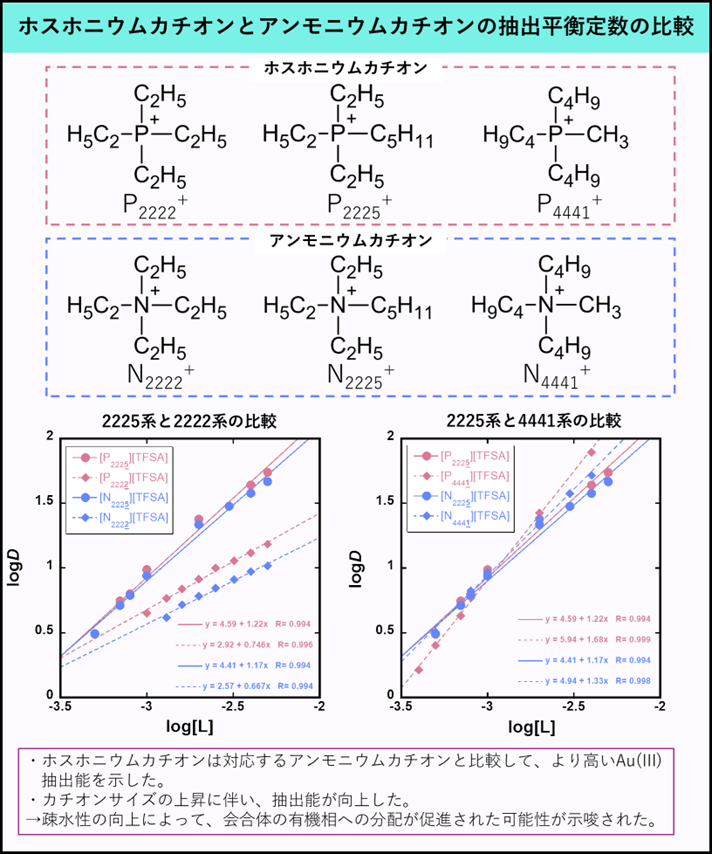 昨年度は、ホスホニウムカチオンとアンモニウムカチオンをそれぞれ抽出剤とした際の、Au(III)のみかけの抽出平衡定数を比較しました。その結果、一貫して、ホスホニウムカチオンは対応するアンモニウムカチオンよりも高い抽出平衡定数を示すことがわかりました。これは、ホスホニウムカチオンが対応するアンモニウムカチオンと比較して、より安定な会合体を形成することに加え、計算値から予測されるホスホニウムカチオンの疎水性が対応するアンモニウムカチオンの疎水性よりも高いことも一つの要因であると考えられます。