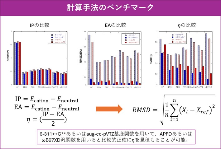 実験テーマ①の内容に関連しますが、種々のパラメータを検討するにあたり、パラメータの算出値そのものが正確である必要があります。そのため、複数の基底関数とDFT汎関数を対象として、「どれだけ計算リソースを削減しても正確性を損なわないか」を中心として検討しております。