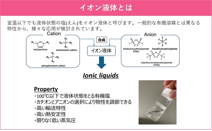 イオン液体は、蒸気圧が限りなく0に近いという特徴を持ちます。このことから、揮発することなく、繰り返し利用できる点で環境に対してグリーンな溶媒であると言えます。