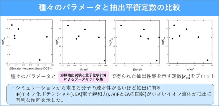 抽出剤設計において、事前に計算から抽出剤としてのポテンシャルをスクリーニングできることで、最小限の実験から、有用な抽出剤の発見に結びつくことが期待できます。本研究では、貴金属元素を対象として、種々のパラメータから、貴金属の抽出平衡定数の予測を定量的に行うことを目的としています。